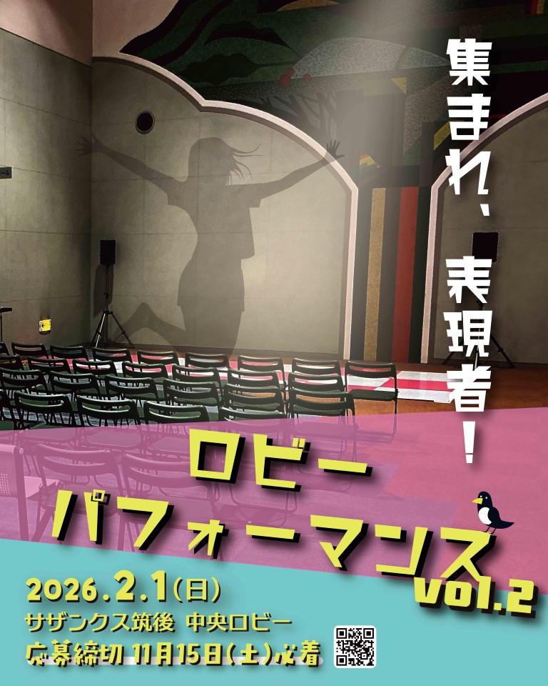 サザンクス筑後のロビーパフォーマンスは、市民が気軽に参加できるイベントとして、様々なジャンルのアーティストの発表・交流の機会として開催します。各種パフォーマンス披露・活動の宣伝などをしてみませんか?(参加費・観覧費無料)