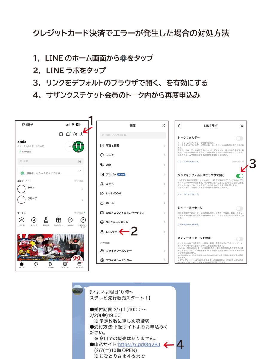 2026.02.07 カード決済時のエラーについて 2/7日17:00現在、スターダスト☆レビュー先着先行フォームからお申込みいただいた際に、一部のお客様においてクレジットカード決済エラーが発生する事象が確認されております。 原因につきましては現在調査中ですが、LINEの設定を変更することで解消される場合がございます。 つきましては、下記に設定変更の手順をご案内いたしますので、お手数ですがご確認・お試しいただけますと幸いです。
